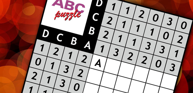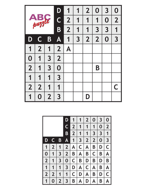 I denne oppgavetypen er det bokstaver som skal plasseres og tallrekkene indikerer hvor mange av hver bokstav det finnes i hver rad og kolonne.