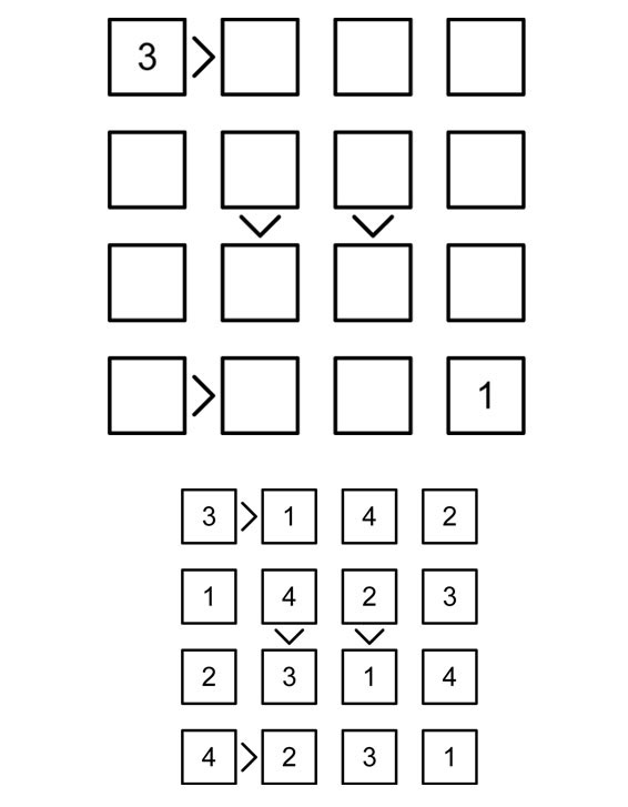 Fyll inn tallene fra 1-4 (slik eksemplet over) slik at alle de loddrette og vannrette radene inneholder sifrene 1-4 en gang (samme fremgangsmåte som i Sudoku.)